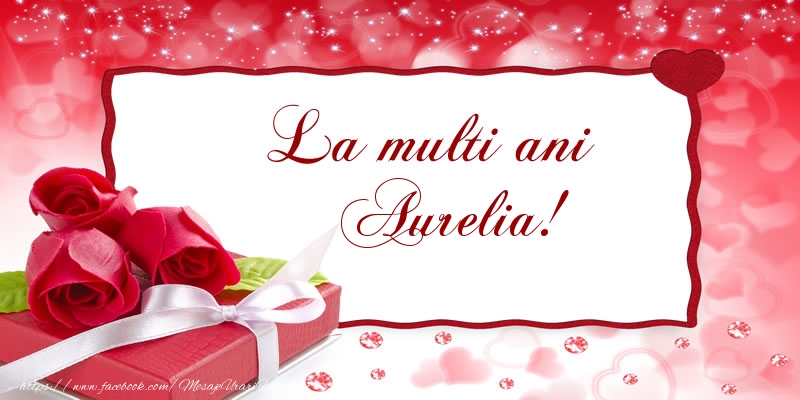 La multi ani Aurelia! | Felicitare cu cadou și trandafiri în chenar roșu cu inimioare | Felicitari de la multi ani