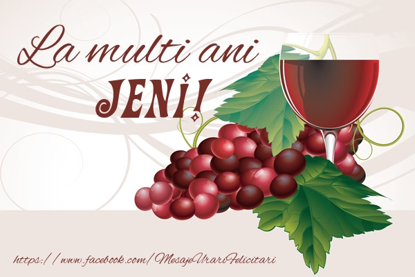 La multi ani Jeni! | Felicitare cu fundal cu un pahar de vin roșu si ciorchine de strugure | Felicitari de la multi ani