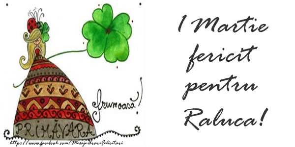 Transformă Mărțișorul într-o experiență personală! Această felicitare de 1 Martie cu mărțișor cu o primăvară frumoasă este gândită și creată cu atenție, iar numele Raluca se îmbină armonios în designul primăvăratic. O urare cu adevărat specială pentru o persoană unică.