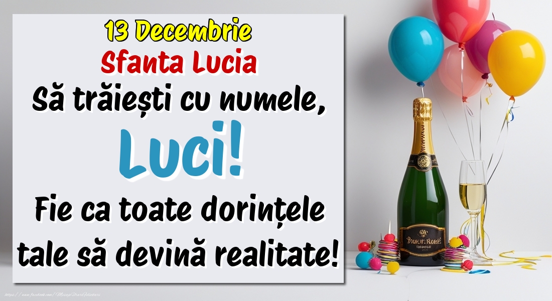 13 Decembrie - Sfanta Lucia -  Să trăiești cu numele, Luci! Fie ca toate dorințele tale să devină realitate! | Felicitare cu șampanie cu un pahar și baloane colorate | Felicitari de Ziua Numelui