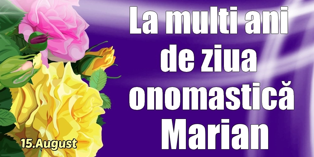 15.August - La mulți ani de ziua onomastică Marian! | Felicitare cu trandafiri galben și roz | Felicitari de Ziua Numelui