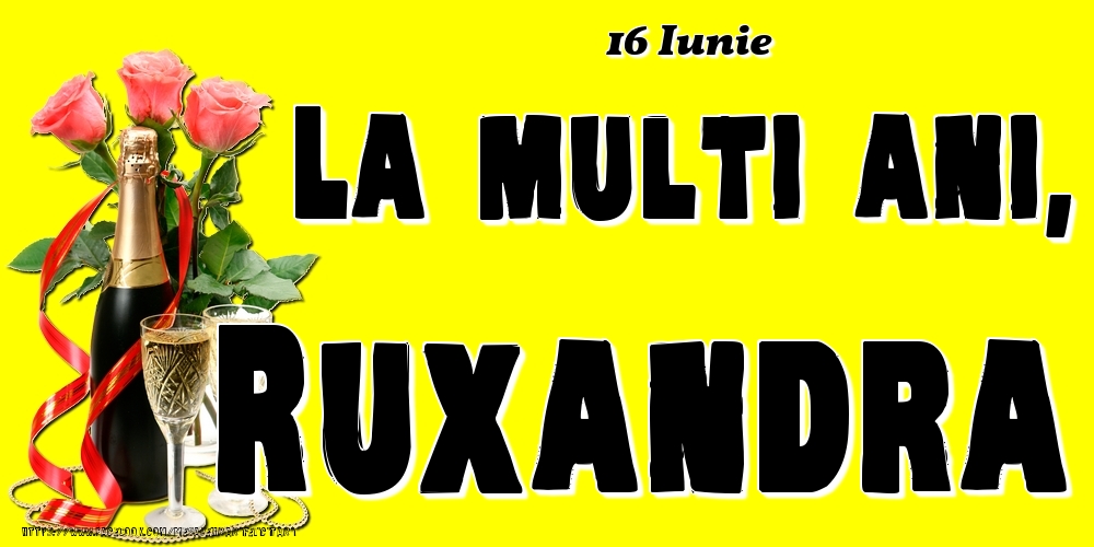 16 Iunie -La  mulți ani Ruxandra! | Felicitare cu șampanie și 3 trandafiri pe fundal galben | Felicitari de Ziua Numelui
