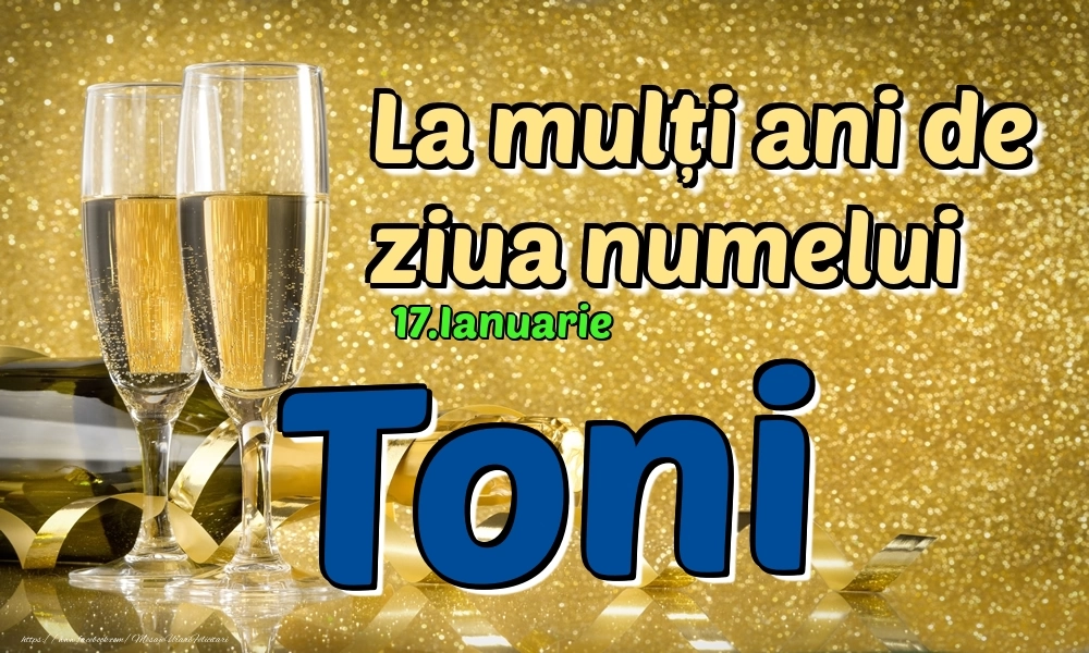 Această felicitare cu șampanie pentru bărbați din colecția noastră de felicitari de ziua numelui cu numele Toni are o notă de originalitate și îți oferă ocazia să faci o persoană să se simtă specială datorită faptului că acolo este numele ei. Felicitarea se poate descărca gratuit sau se poate trimite prin Whatsapp, Facebook, Twitter, Pinterest. Imagine de ziua onomastică cu șampanie pentru bărbați cu dimensiunile 1000px x 600px și cu textul 17.Ianuarie - La mulți ani de ziua numelui Toni!.