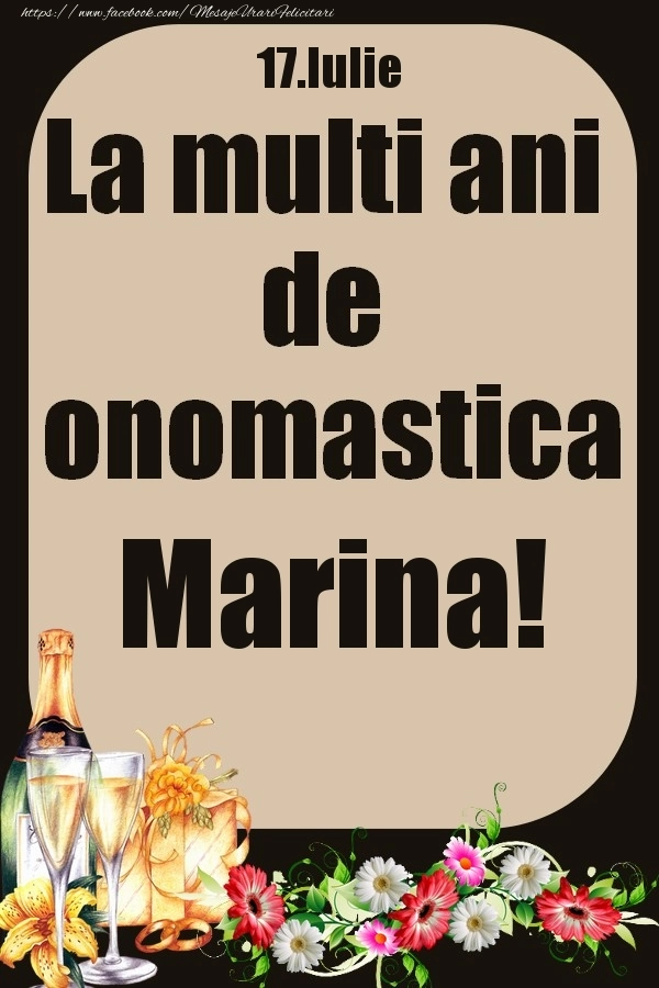 Această felicitare cu flori si sampanie cu pahare din colecția noastră de felicitari de ziua numelui cu numele Marina are o notă de originalitate și îți oferă ocazia să faci o persoană să se simtă specială datorită faptului că acolo este numele ei. Felicitarea se poate descărca gratuit sau se poate trimite prin Whatsapp, Facebook, Twitter, Pinterest. Imagine de ziua onomastică cu flori si sampanie cu pahare cu dimensiunile 600px x 900px și cu textul 17.Iulie - La multi ani de onomastica Marina!.
