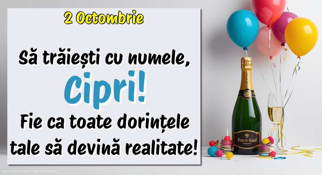 2 Octombrie -  -  Să trăiești cu numele, Cipri! Fie ca toate dorințele tale să devină realitate! | Felicitare cu șampanie cu un pahar și baloane colorate | Felicitari de Ziua Numelui