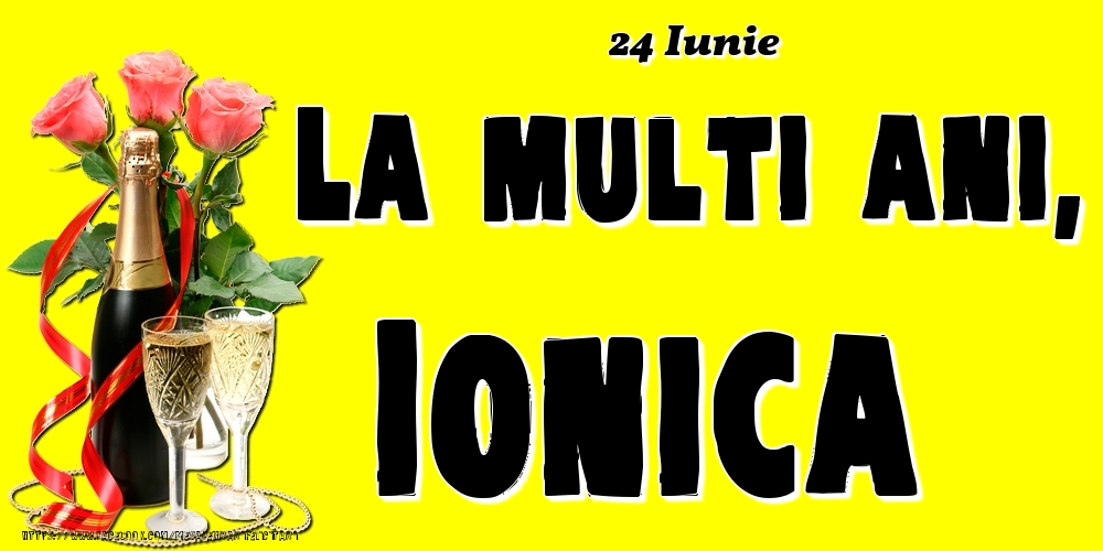24 Iunie -La  mulți ani Ionica! | Felicitare cu șampanie și 3 trandafiri pe fundal galben | Felicitari de Ziua Numelui