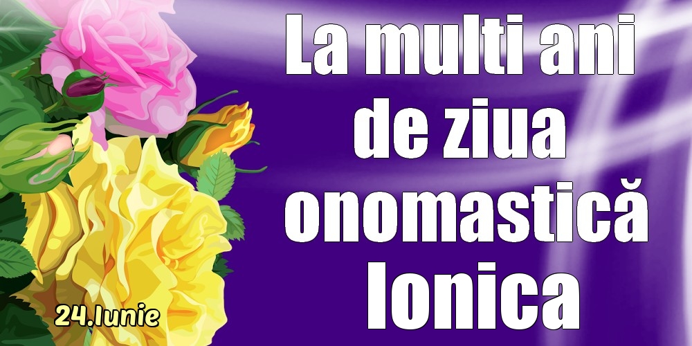 24.Iunie - La mulți ani de ziua onomastică Ionica! | Felicitare cu trandafiri galben și roz | Felicitari de Ziua Numelui