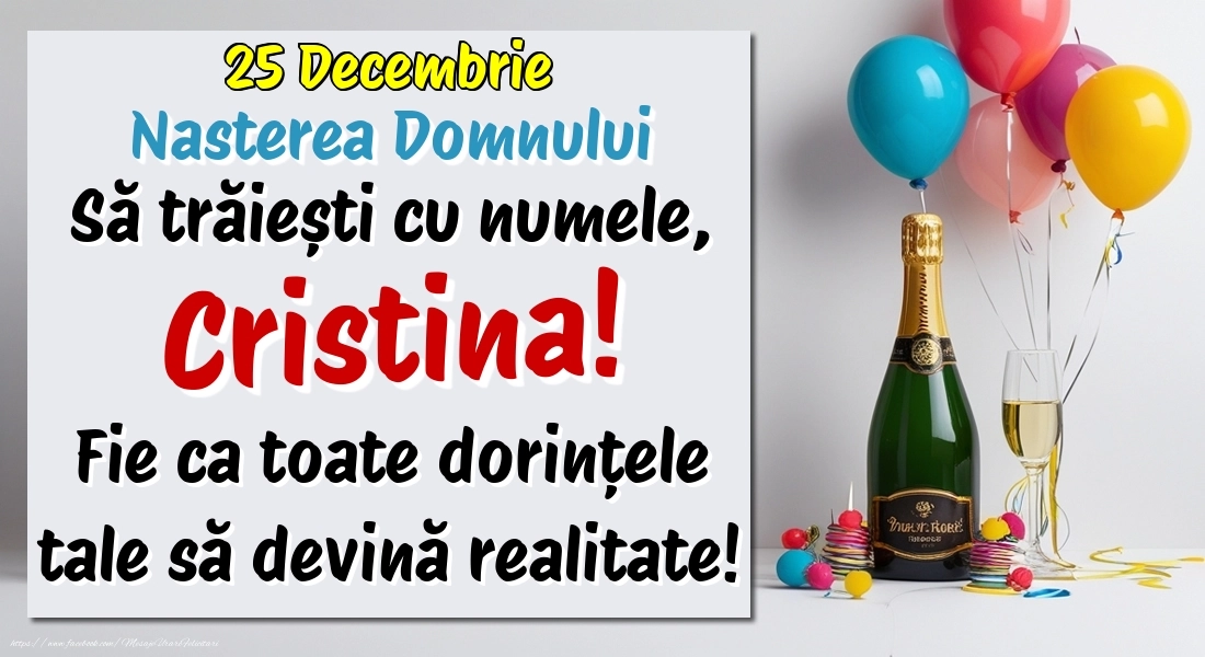 Poezie de ziua numelui: De ziua ce-ti surade-n prag / Si-i porti frumosul nume, / Eu iti doresc tot ce-i mai drag / Si mai frumos pe lume. La multi ani, Cristina!