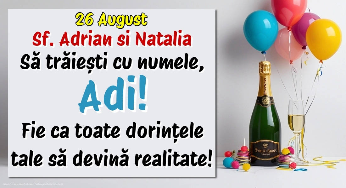 26 August - Sf. Adrian si Natalia -  Să trăiești cu numele, Adi! Fie ca toate dorințele tale să devină realitate! | Felicitare cu șampanie cu un pahar și baloane colorate | Felicitari de Ziua Numelui