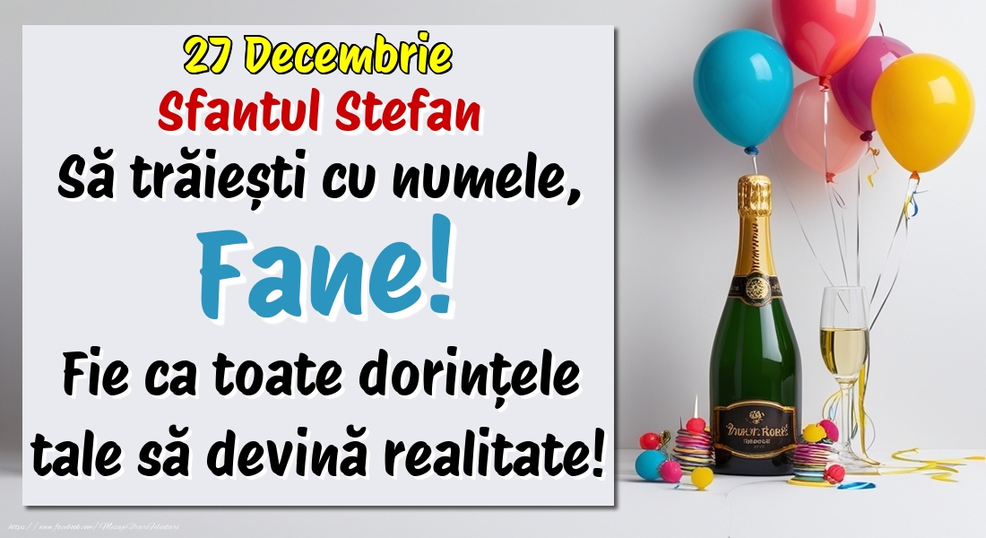 27 Decembrie - Sfantul Stefan -  Să trăiești cu numele, Fane! Fie ca toate dorințele tale să devină realitate! | Felicitare cu șampanie cu un pahar și baloane colorate | Felicitari de Ziua Numelui