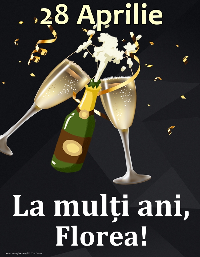 Această felicitare cu șampanie și pahare pe fundal negru pentru bărbați din colecția noastră de felicitari de ziua numelui cu numele Florea are o notă de originalitate și îți oferă ocazia să faci o persoană să se simtă specială datorită faptului că acolo este numele ei. Felicitarea se poate descărca gratuit sau se poate trimite prin Whatsapp, Facebook, Twitter, Pinterest. Imagine de ziua onomastică cu șampanie și pahare pe fundal negru pentru bărbați cu dimensiunile 700px x 900px și cu textul 28 Aprilie - La mulți ani, Florea!.