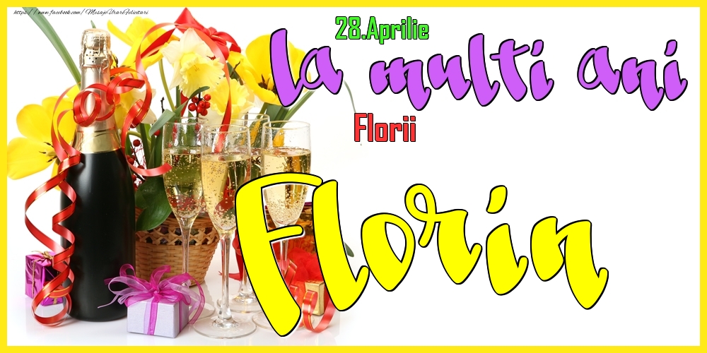 28.Aprilie - La mulți ani Florin! - Florii | Felicitare cu flori galbene în coș și sampanie cu pahare | Felicitari de Ziua Numelui