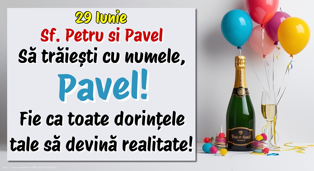 29 Iunie - Sf. Petru si Pavel -  Să trăiești cu numele, Pavel! Fie ca toate dorințele tale să devină realitate! | Felicitare cu șampanie cu un pahar și baloane colorate | Felicitari de Ziua Numelui