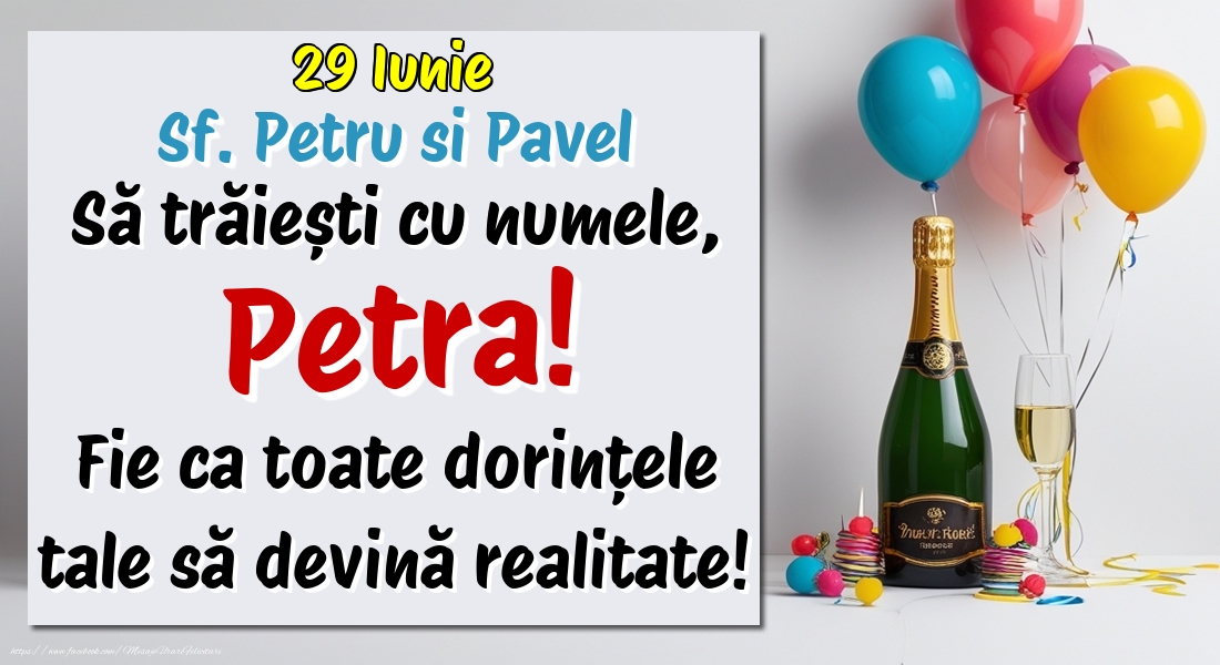 29 Iunie - Sf. Petru si Pavel -  Să trăiești cu numele, Petra! Fie ca toate dorințele tale să devină realitate! | Felicitare cu șampanie cu un pahar și baloane colorate | Felicitari de Ziua Numelui