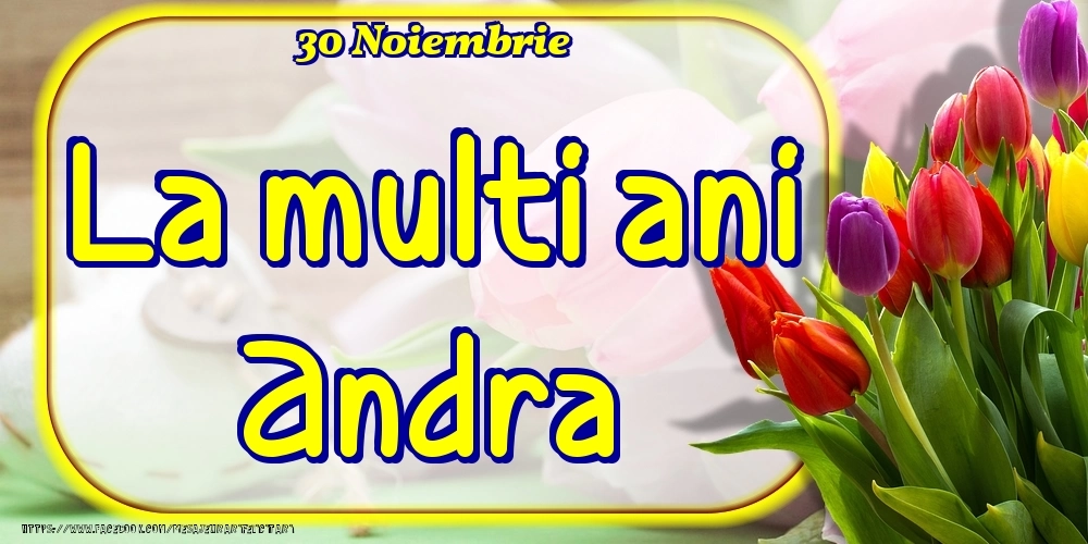 Această felicitare cu lalele colorate din colecția noastră de felicitari de ziua numelui cu numele Andra are o notă de originalitate și îți oferă ocazia să faci o persoană să se simtă specială datorită faptului că acolo este numele ei. Felicitarea se poate descărca gratuit sau se poate trimite prin Whatsapp, Facebook, Twitter, Pinterest. Imagine de ziua onomastică cu lalele colorate cu dimensiunile 1000px x 500px și cu textul 30 Noiembrie -La mulți ani Andra!.