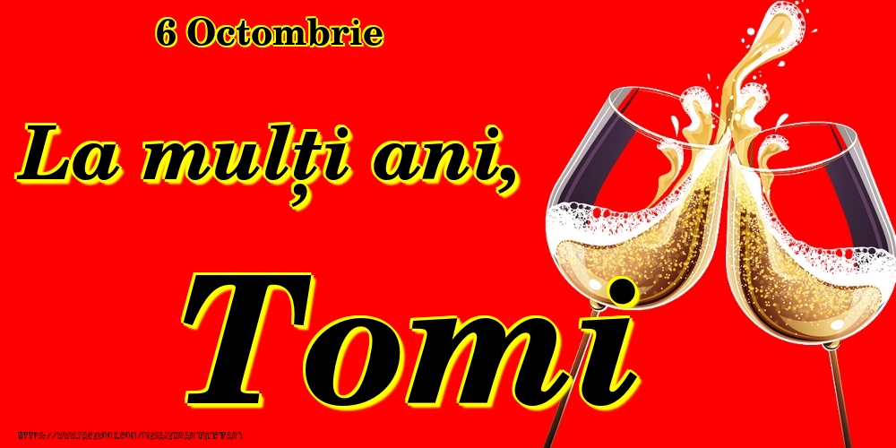 6 Octombrie -La  mulți ani Tomi! | Felicitare cu pahare de șampanie pe fundal roșu | Felicitari de Ziua Numelui