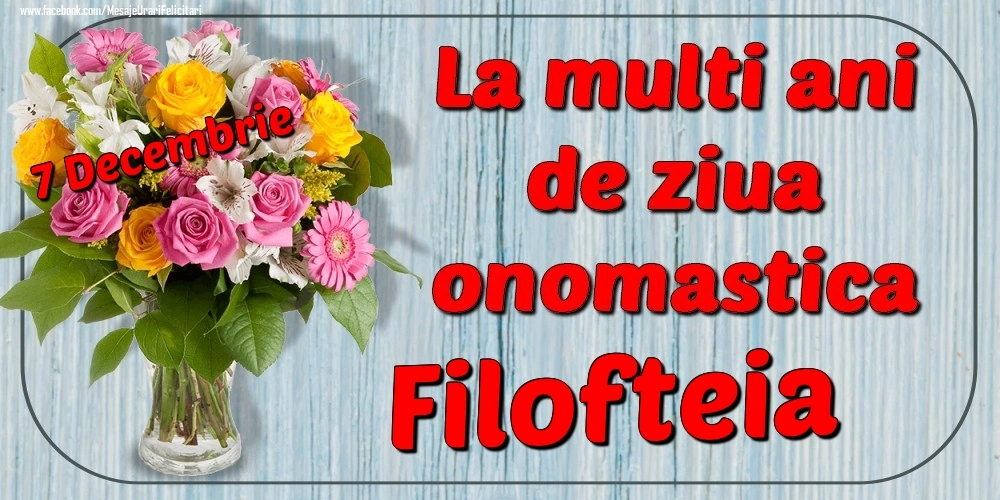7 Decembrie - La mulți ani de ziua onomastică Filofteia | Felicitare cu buchet de flori roz, albe și galbene în vază | Felicitari de Ziua Numelui