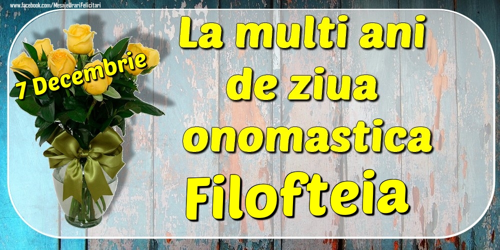 7 Decembrie - La mulți ani de ziua onomastică Filofteia | Felicitare cu buchet de trandafiri galbeni în vază | Felicitari de Ziua Numelui