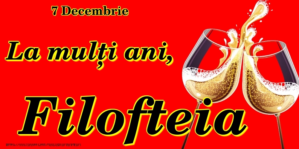 7 Decembrie -La  mulți ani Filofteia! | Felicitare cu pahare de șampanie pe fundal roșu | Felicitari de Ziua Numelui