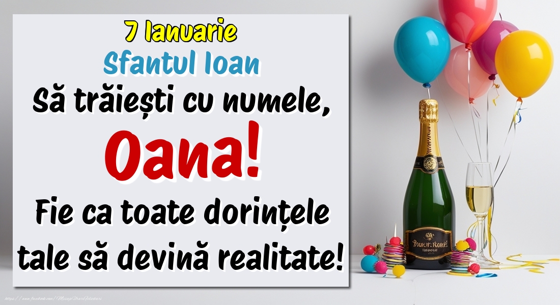 7 Ianuarie - Sfantul Ioan -  Să trăiești cu numele, Oana! Fie ca toate dorințele tale să devină realitate! | Felicitare cu șampanie cu un pahar și baloane colorate | Felicitari de Ziua Numelui