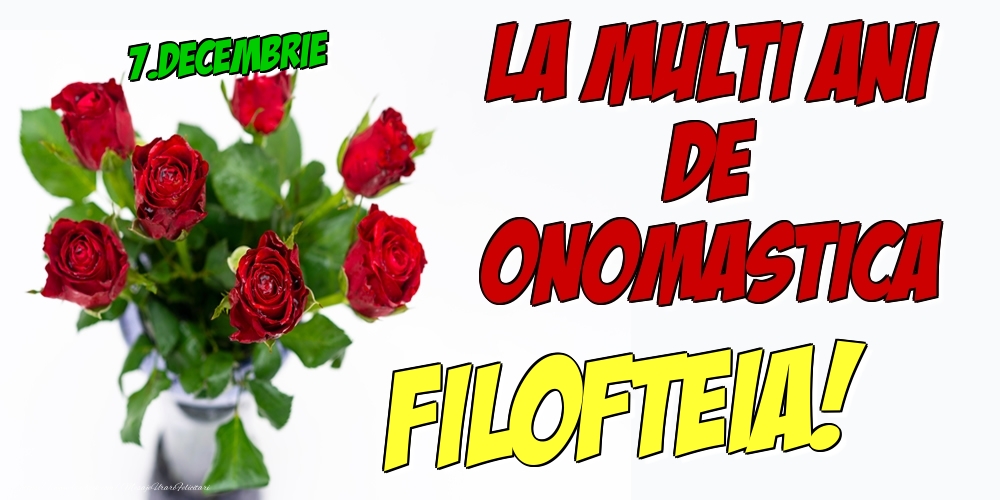 7.Decembrie - La multi ani de onomastica Filofteia! | Felicitare cu 7 trandafiri roșii în vază pentru o prietenă | Felicitari de Ziua Numelui