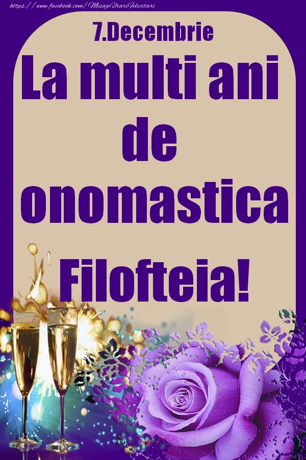 7.Decembrie - La multi ani de onomastica Filofteia! | Felicitare cu pahare de sampanie si trandafiri | Felicitari de Ziua Numelui