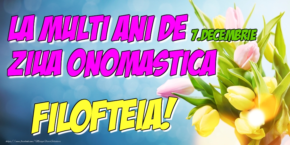 7.Decembrie - La multi ani de ziua onomastica Filofteia! | Felicitare cu lalele galbene și roz pentru femei | Felicitari de Ziua Numelui