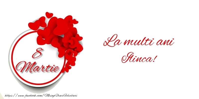 Oferiți mai mult decât un simplu cadou - oferiți o emoție personalizată de Ziua Femeii cu numele Ilinca! Felicitarea de 8 Martie cu inimioare pentru femei sau fete este menită să încânte și să emoționeze, sărbătorind feminitatea în toată splendoarea sa.