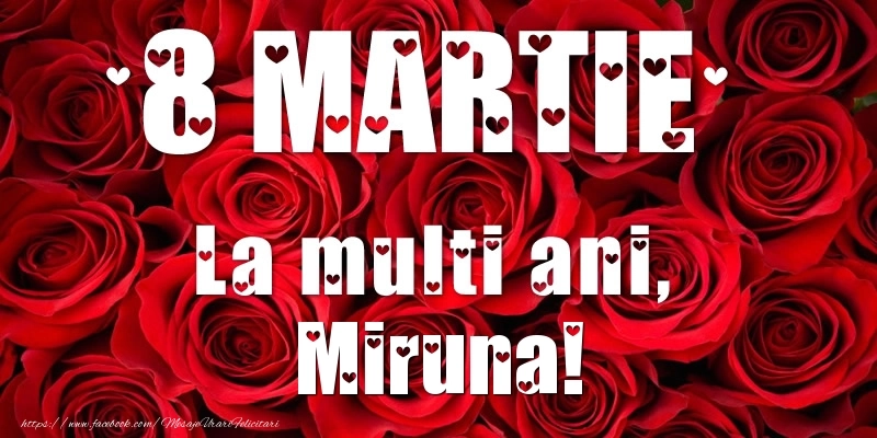 Oferiți mai mult decât un simplu cadou - oferiți o emoție personalizată de Ziua Femeii cu numele Miruna! Felicitarea de 8 Martie cu fundal cu trandafiri este menită să încânte și să emoționeze, sărbătorind feminitatea în toată splendoarea sa.