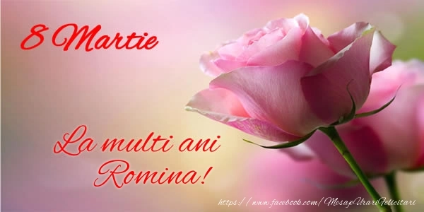 Oferiți mai mult decât un simplu cadou - oferiți o emoție personalizată de Ziua Femeii cu numele Romina! Felicitarea de 8 Martie cu trandafiri roz pentru femei sau fete este menită să încânte și să emoționeze, sărbătorind feminitatea în toată splendoarea sa.