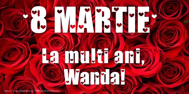 Oferiți mai mult decât un simplu cadou - oferiți o emoție personalizată de Ziua Femeii cu numele Wanda! Felicitarea de 8 Martie cu fundal cu trandafiri este menită să încânte și să emoționeze, sărbătorind feminitatea în toată splendoarea sa.