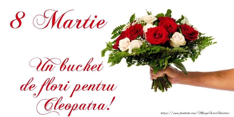 Această felicitare cu buchet de trandafiri in mana din colecția noastră de felicitari de Ziua Femeii cu numele Cleopatra are o notă de originalitate și îți oferă ocazia să faci o persoană să se simtă specială datorită faptului că acolo este numele ei. Felicitarea se poate descărca gratuit sau se poate trimite prin Whatsapp, Facebook, Twitter, Pinterest. Imagine de 8 Martie cu buchet de trandafiri in mana cu dimensiunile 800px x 400px și cu textul 8 Martie Un buchet de flori pentru Cleopatra!.