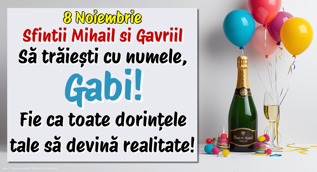8 Noiembrie - Sfintii Mihail si Gavriil -  Să trăiești cu numele, Gabi! Fie ca toate dorințele tale să devină realitate! | Felicitare cu șampanie cu un pahar și baloane colorate | Felicitari de Ziua Numelui