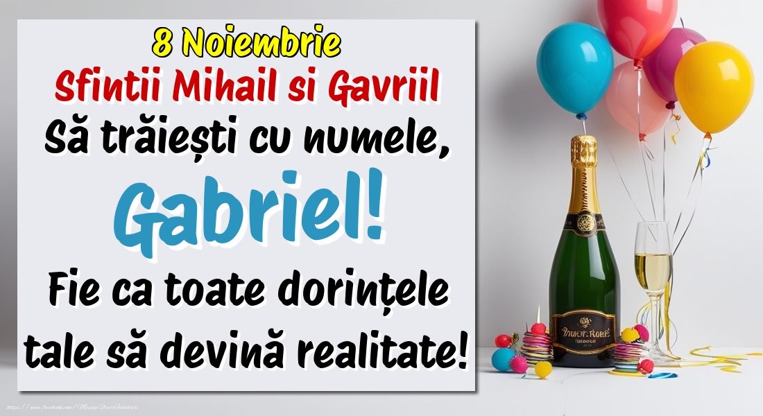 8 Noiembrie - Sfintii Mihail si Gavriil -  Să trăiești cu numele, Gabriel! Fie ca toate dorințele tale să devină realitate! | Felicitare cu șampanie cu un pahar și baloane colorate | Felicitari de Ziua Numelui