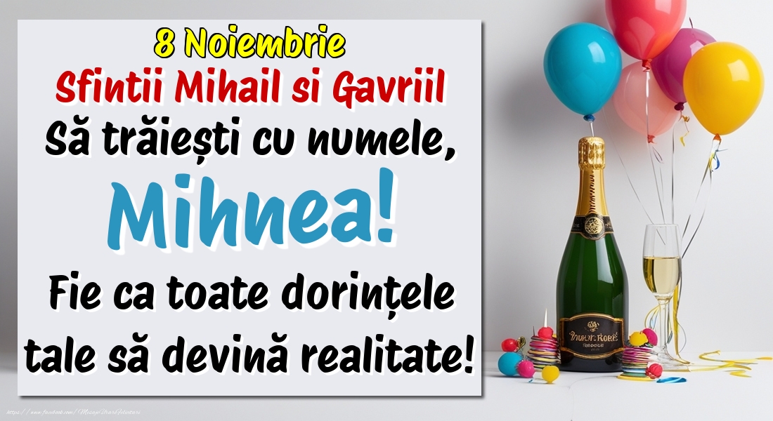 8 Noiembrie - Sfintii Mihail si Gavriil -  Să trăiești cu numele, Mihnea! Fie ca toate dorințele tale să devină realitate! | Felicitare cu șampanie cu un pahar și baloane colorate | Felicitari de Ziua Numelui