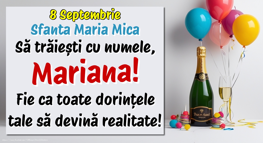 8 Septembrie - Sfanta Maria Mica -  Să trăiești cu numele, Mariana! Fie ca toate dorințele tale să devină realitate! | Felicitare cu șampanie cu un pahar și baloane colorate | Felicitari de Ziua Numelui
