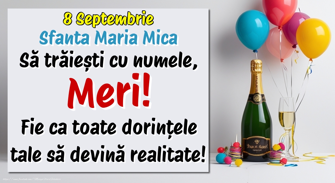 8 Septembrie - Sfanta Maria Mica -  Să trăiești cu numele, Meri! Fie ca toate dorințele tale să devină realitate! | Felicitare cu șampanie cu un pahar și baloane colorate | Felicitari de Ziua Numelui