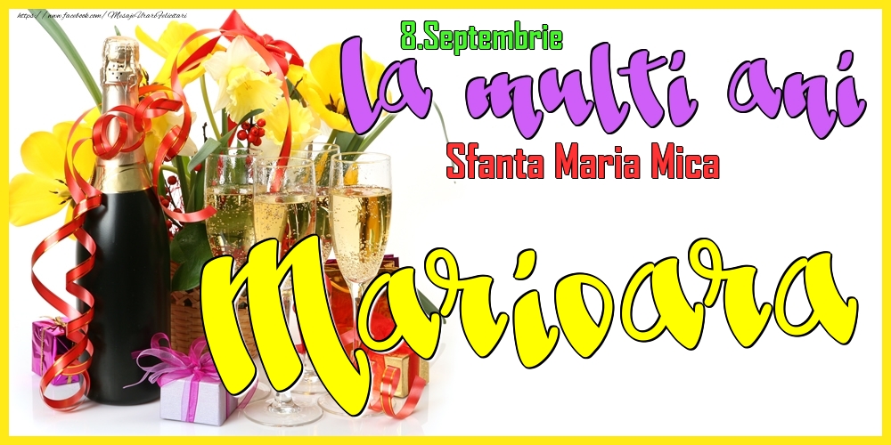 8.Septembrie - La mulți ani Marioara! - Sfanta Maria Mica | Felicitare cu flori galbene în coș și sampanie cu pahare | Felicitari de Ziua Numelui