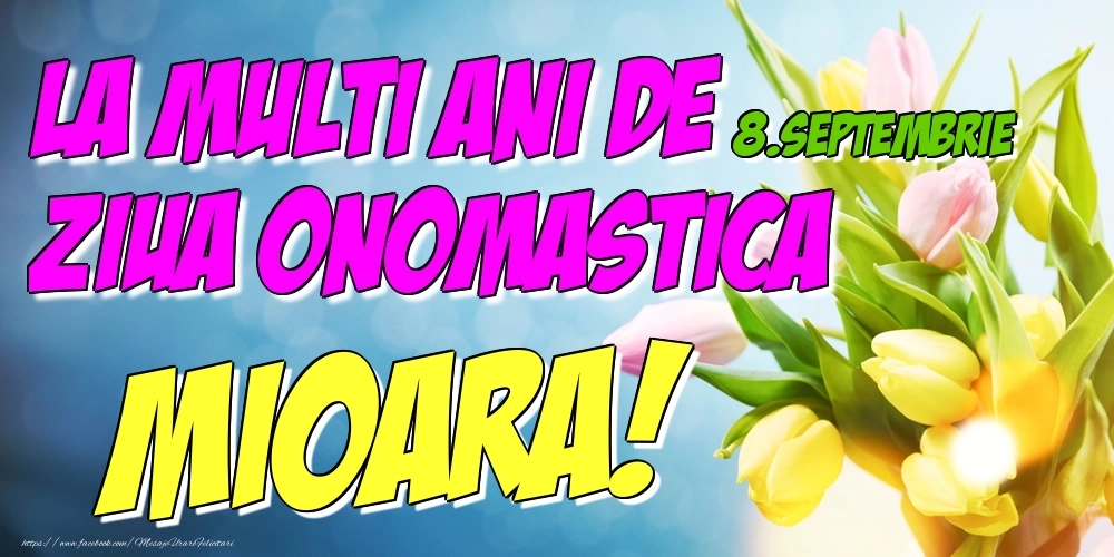 8.Septembrie - La multi ani de ziua onomastica Mioara! | Felicitare cu lalele galbene și roz pentru femei | Felicitari de Ziua Numelui