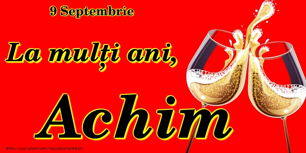 Această felicitare cu pahare de șampanie pe fundal roșu din colecția noastră de felicitari de ziua numelui cu numele Achim are o notă de originalitate și îți oferă ocazia să faci o persoană să se simtă specială datorită faptului că acolo este numele ei. Felicitarea se poate descărca gratuit sau se poate trimite prin Whatsapp, Facebook, Twitter, Pinterest. Imagine de ziua onomastică cu pahare de șampanie pe fundal roșu cu dimensiunile 1000px x 500px și cu textul 9 Septembrie -La mulți ani Achim!.