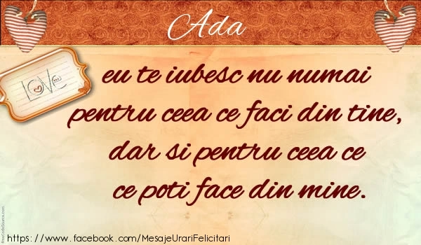 Această felicitare cu inimioare și un mesaj frumos din colecția noastră de felicitari de dragoste cu numele Ada are o notă de originalitate și îți oferă ocazia să faci o persoană să se simtă specială datorită faptului că acolo este numele ei. Felicitarea se poate descărca gratuit sau se poate trimite prin Whatsapp, Facebook, Twitter, Pinterest. Imagine de iubire cu inimioare și un mesaj frumos cu dimensiunile 600px x 350px și cu textul Ada eu te iubesc nu numai pentru ceea ce faci din tine, dar si pentru ceea ce poti face din mine. .