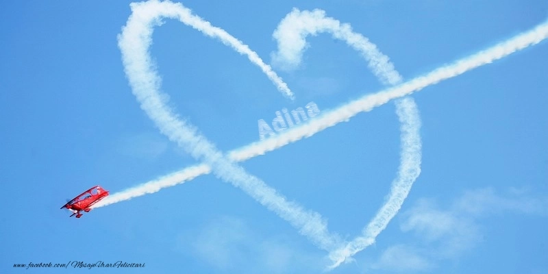 Această felicitare cu inimă facută de un avion din colecția noastră de felicitari de dragoste cu numele Adina are o notă de originalitate și îți oferă ocazia să faci o persoană să se simtă specială datorită faptului că acolo este numele ei. Felicitarea se poate descărca gratuit sau se poate trimite prin Whatsapp, Facebook, Twitter, Pinterest. Imagine de iubire cu inimă facută de un avion cu dimensiunile 800px x 400px și cu textul Adina.