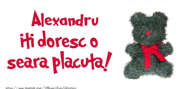 Această felicitare cu ursuleț de pluș din colecția noastră de felicitari de buna seara cu numele Alexandru are o notă de originalitate și îți oferă ocazia să faci o persoană să se simtă specială datorită faptului că acolo este numele ei. Felicitarea se poate descărca gratuit sau se poate trimite prin Whatsapp, Facebook, Twitter, Pinterest. Imagine de bună seara cu ursuleț de pluș cu dimensiunile 600px x 300px și cu textul Alexandru iti doresc o seara placuta!.