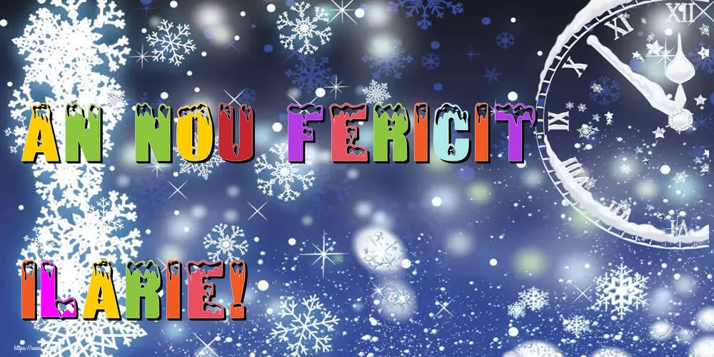 Această felicitare cu steluțe și ceas de gheață din colecția noastră de felicitari de Anul Nou cu numele Ilarie are o notă de originalitate și îți oferă ocazia să faci o persoană să se simtă specială datorită faptului că acolo este numele ei. Felicitarea se poate descărca gratuit sau se poate trimite prin Whatsapp, Facebook, Twitter, Pinterest. Imagine de Anul Nou cu steluțe și ceas de gheață cu dimensiunile 1000px x 500px și cu textul An nou fericit Ilarie!.