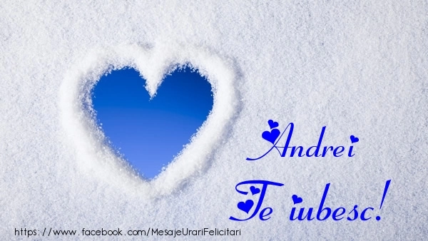 Această felicitare cu inimioara in zapada din colecția noastră de felicitari de dragoste cu numele Andrei are o notă de originalitate și îți oferă ocazia să faci o persoană să se simtă specială datorită faptului că acolo este numele ei. Felicitarea se poate descărca gratuit sau se poate trimite prin Whatsapp, Facebook, Twitter, Pinterest. Imagine de iubire cu inimioara in zapada cu dimensiunile 600px x 338px și cu textul Andrei Te iubesc!.