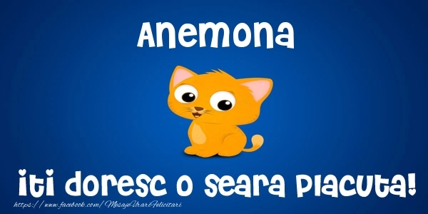 Această felicitare cu o pisicuță haioasă din colecția noastră de felicitari de buna seara cu numele Anemona are o notă de originalitate și îți oferă ocazia să faci o persoană să se simtă specială datorită faptului că acolo este numele ei. Felicitarea se poate descărca gratuit sau se poate trimite prin Whatsapp, Facebook, Twitter, Pinterest. Imagine de bună seara cu o pisicuță haioasă cu dimensiunile 600px x 300px și cu textul Anemona iti doresc o seara placuta!.
