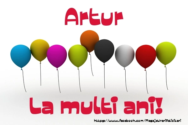 Felicitarea cu baloane colorate este ca o explozie de bucurie și culoare, iar numele Artur este adăugat cu gingășie pentru a personaliza această experiență de sărbătoare. Este modul tău de a spune la mulți ani într-un mod unic și special!