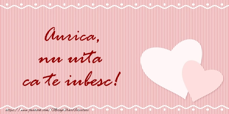 Această felicitare cu inimioare pe fundal roz din colecția noastră de felicitari de dragoste cu numele Aurica are o notă de originalitate și îți oferă ocazia să faci o persoană să se simtă specială datorită faptului că acolo este numele ei. Felicitarea se poate descărca gratuit sau se poate trimite prin Whatsapp, Facebook, Twitter, Pinterest. Imagine de iubire cu inimioare pe fundal roz cu dimensiunile 800px x 400px și cu textul Aurica nu uita ca te iubesc!.