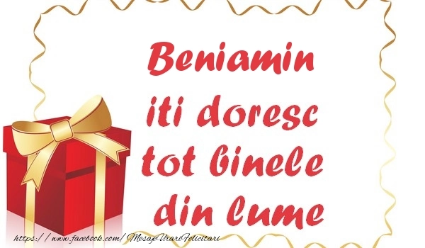 Această felicitare cu cadou în cutie din colecția noastră de felicitari de la multi ani cu numele Beniamin are o notă de originalitate și îți oferă ocazia să faci o persoană să se simtă specială datorită faptului că acolo este numele ei. Felicitarea se poate descărca gratuit sau se poate trimite prin Whatsapp, Facebook, Twitter, Pinterest. Imagine de la mulți ani cu cadou în cutie cu dimensiunile 600px x 350px și cu textul Beniamin iti doresc tot binele din lume.