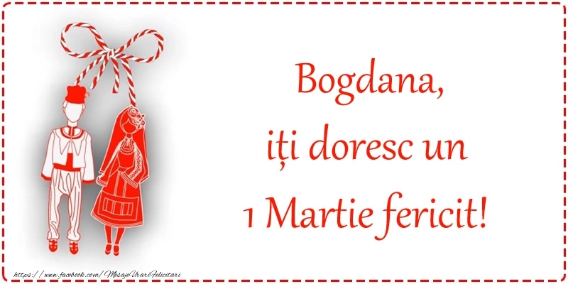 Transformă Mărțișorul într-o experiență personală! Această felicitare de 1 Martie cu mărtisor tradițional cu două persoane este gândită și creată cu atenție, iar numele Bogdana se îmbină armonios în designul primăvăratic. O urare cu adevărat specială pentru o persoană unică.